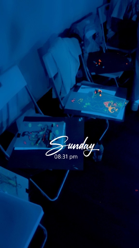 One of the most exciting aspects of the session was the opportunity to experiment with unconventional techniques. The neon paints and markers reacted uniquely to the UV light, allowing us to play with light and shadow in ways that aren’t possible with traditional materials. This encouraged a sense of playfulness and creativity, pushing us to explore new artistic horizons.