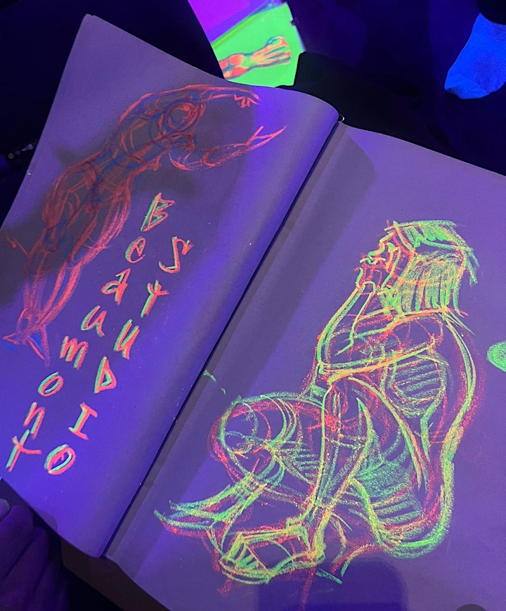 The highlight of the evening was undoubtedly the drawing session with a model adorned in UV-reactive neon body paint and fluorescent accessories, posing elegantly under the blacklight. The atmosphere was mesmerizing, with colors popping vividly against the dark backdrop. The curator expertly guided us through the session, providing tips and encouraging everyone to create at their own pace.