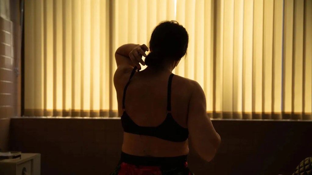 One of the film’s most visually arresting sequences occurs during a climactic confrontation between Emilia and her estranged wife, Jessi. The scene is set against a backdrop of shifting lights, with the camera lingering on the characters’ faces, capturing every flicker of emotion. The use of shadow and light throughout the film further underscores its themes, with Emilia often framed in partial darkness, symbolizing her constant battle between her past and present selves.