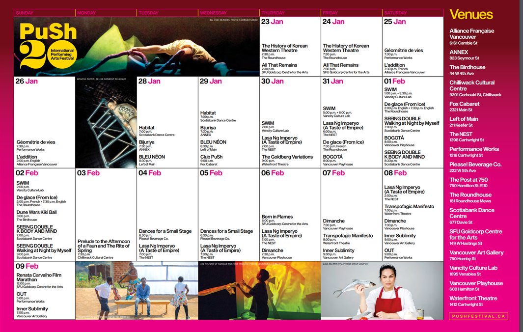 Since its founding in 2003, PuSh has evolved into one of Canada’s most important performing arts festivals, drawing local and international artists into conversation with Vancouver’s ever growing creative scene.